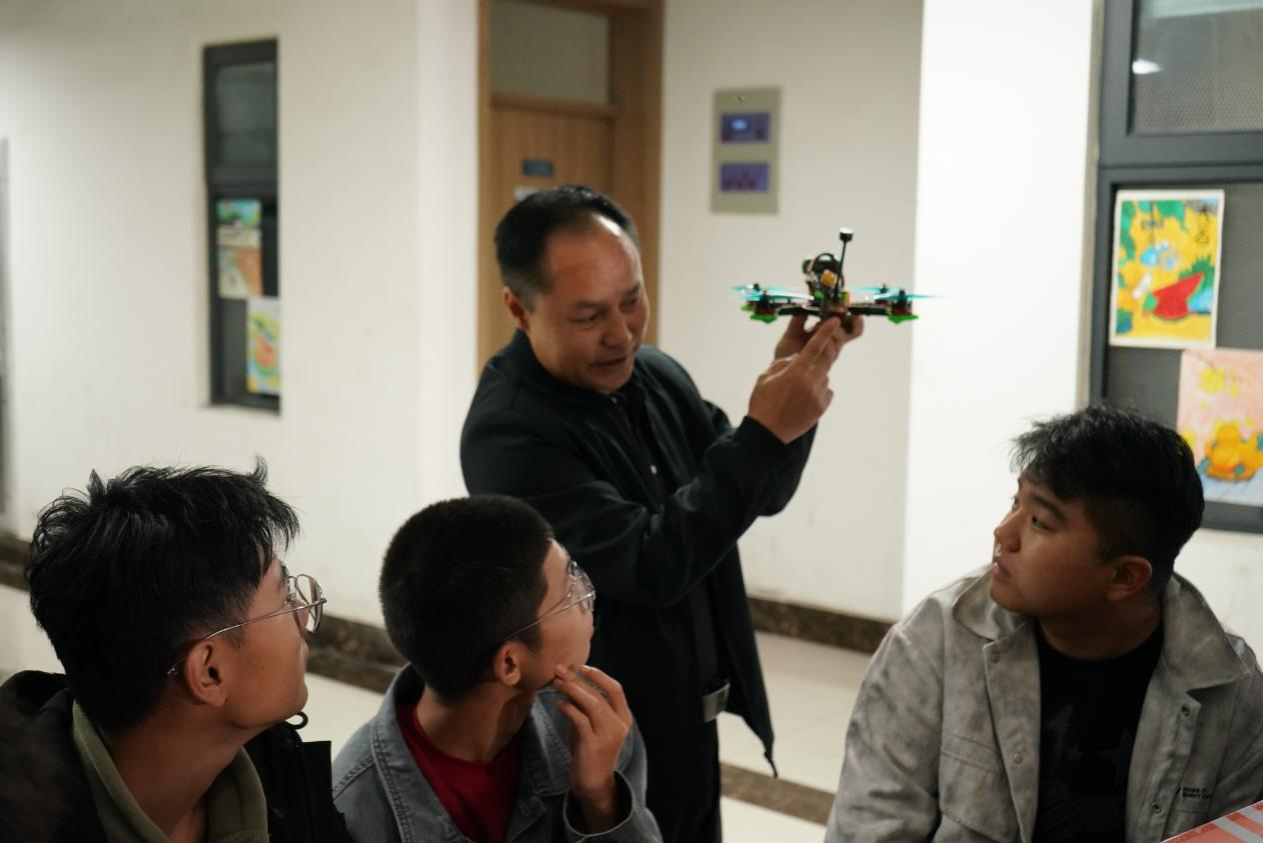 活动中,学院党支部书记陈宏波为同学们讲解无人机工作原理及飞行操作。