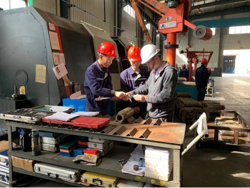 李福玉老师到车间指导日常如何进行机床维修维护,并为企业员工进行焊工技能评定。