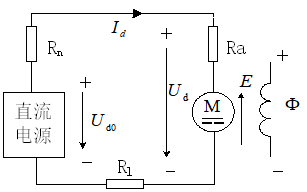 Udo 为电源空载电压;Ud为电动机电枢电压;E为电枢电动势;R为电枢回路总电阻,R=Rn+Ra+R1; Rn 为直流电源内阻;Ra 为电枢内阻;R1为线路或外接电阻;n 转速,单位r/min;Φ为励磁磁通;Ce为电动机的电动势转速比,Ce=KeΦ;Ke为电动机结构决定的电动势系数。