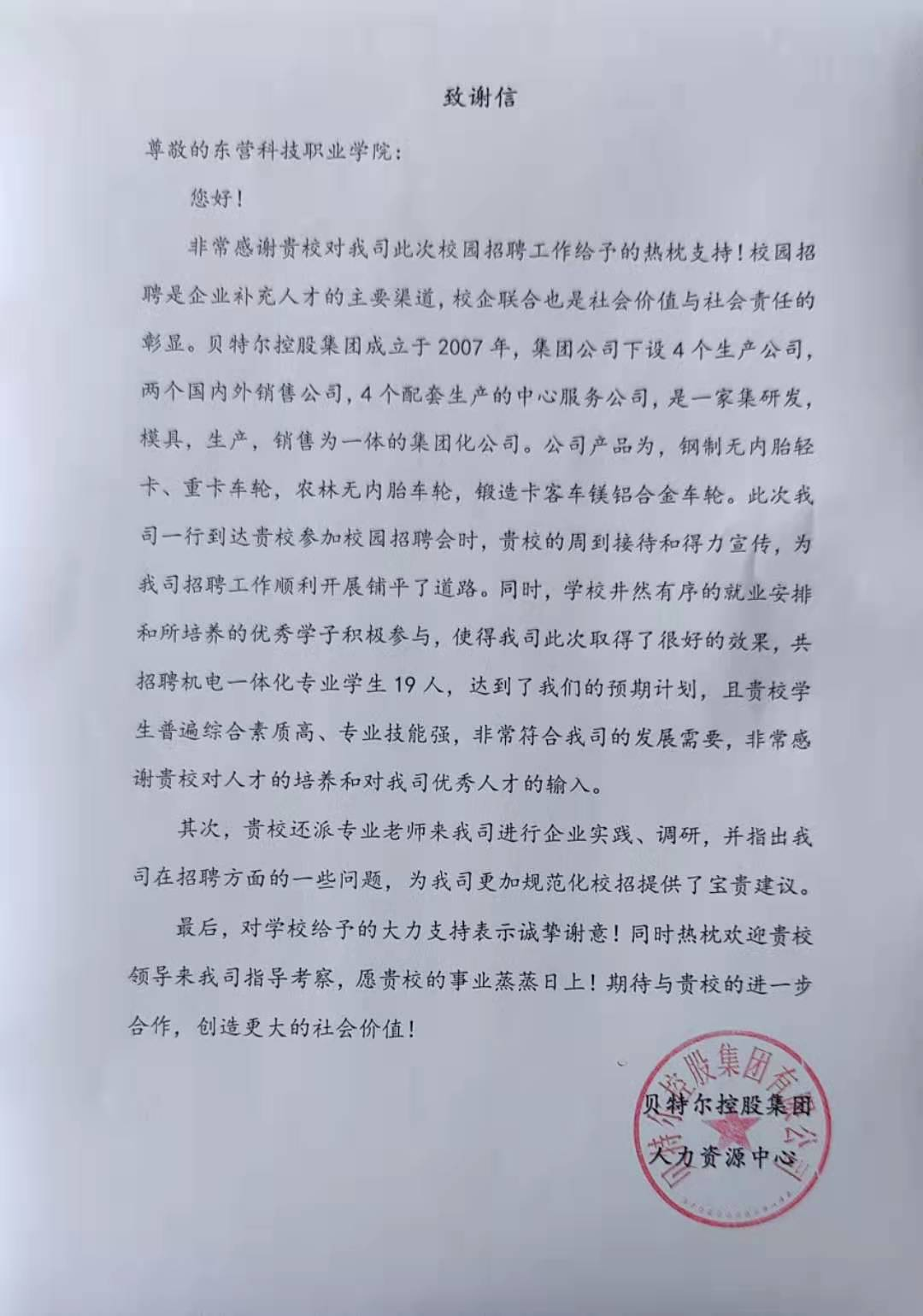 2021年8月12日beat365官网收到来自贝特尔控股集团的致谢信,信中高度评价了beat365官网18级机电一体化专业实习学生的表现,反应beat365官网学生综合素质高,专业技能强,对beat365官网老师的技能培养,学生的日常学习中给予了肯定,充分肯定了beat365官网毕业生的专业能力、综合素质以及学生的创新精神。