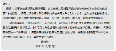 2021年11月26号,接到超星杯高校青年教师校内选拔赛的通知,学院领导对此非常重视,积极的组织青年教师踊跃报名,经过院内选拔,最终王灿青老师和解运超老师代表beat365中文官方网站参加此次比赛。